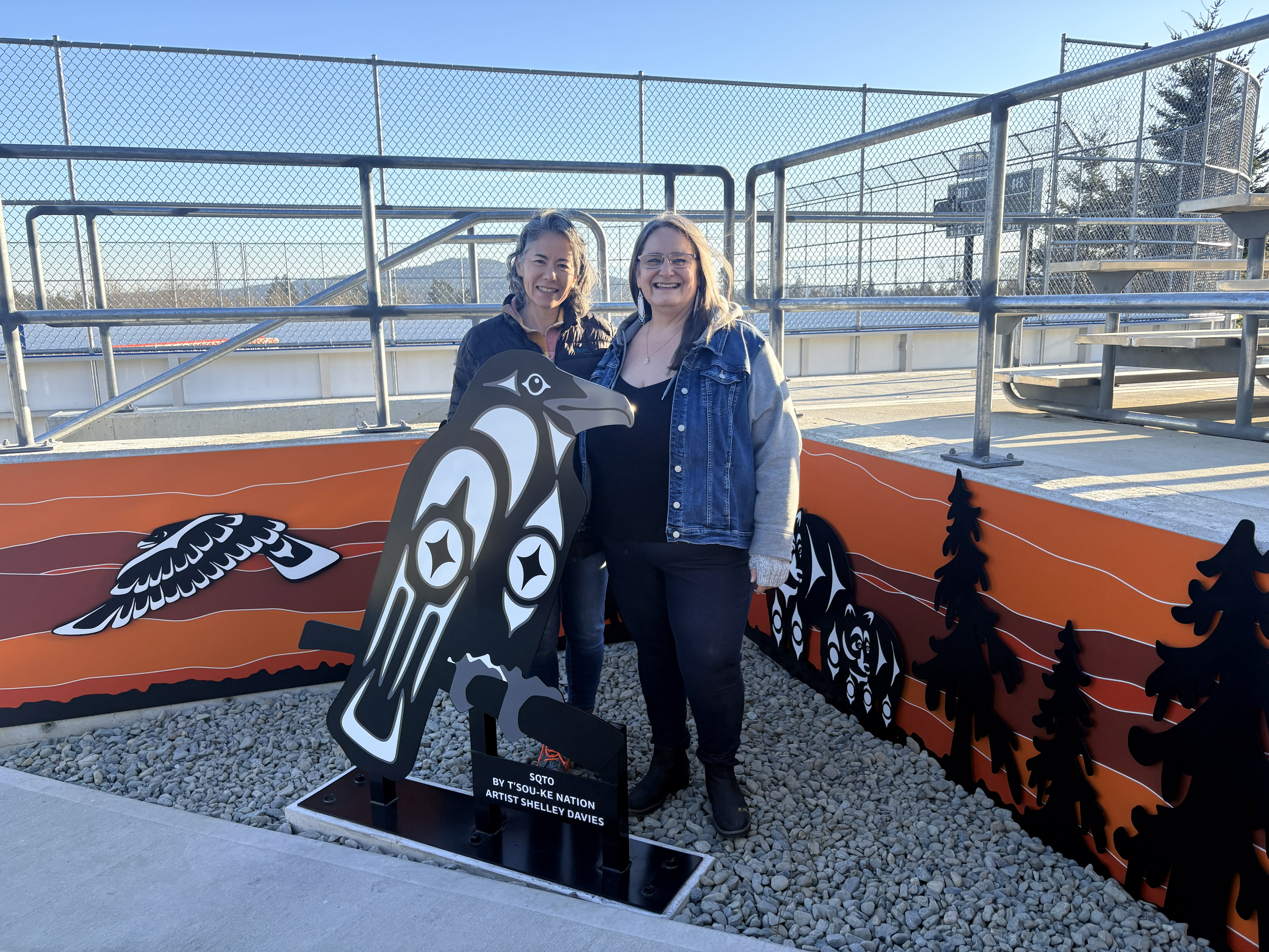 The artwork, SQTO (Raven in Senćoŧen), by artist Shelley Davies, draws inspiration from the park’s name and setting. It features a grounded raven and a second raven in flight, symbolizing movement, perspective, and connection. A mother bear and cub reflect care, protection, and family gathering, while silhouetted trees, stikas, and a bold sunset evoke the west coast landscape.